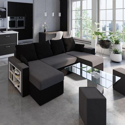 Jonah - canapé panoramique en u 7 places convertible avec coffre et tablette en tissu - gris / noir gris / noir Taille unique
