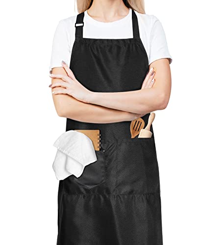 Sienzo Tablier de Cuisine Homme Femme,Imperméable Tabliers avec Poches, Noir Tablier Professionnel pour Barbecue Chef Jardin Café Serveur Restaurant(1x Noir Tablier + 1 X Torchon)