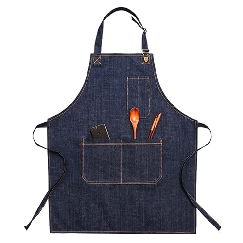 Tablier de chef en denim, tablier de travail pour homme et femme avec bretelles réglables et grandes poches pour salon de coiffure, barbecue, bleu, Medium