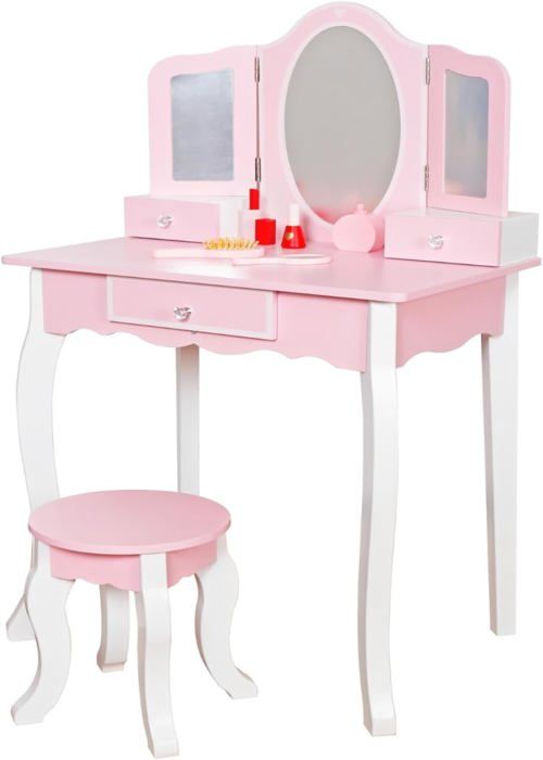 Coiffeuse enfant design scandinave - tabouret inclus - 2 tiroirs, niche, miroir - bois pin mdf blanc