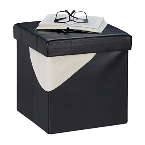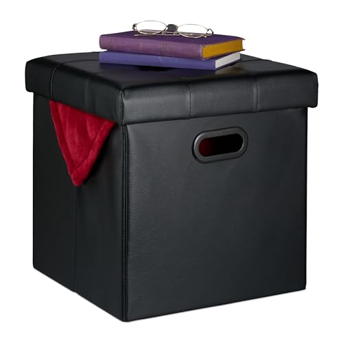 Relaxdays Tabouret de Rangement, rembourré, Pliable, HLP : 39x37x37 cm, Similicuir, Salon, Chambre, Noir