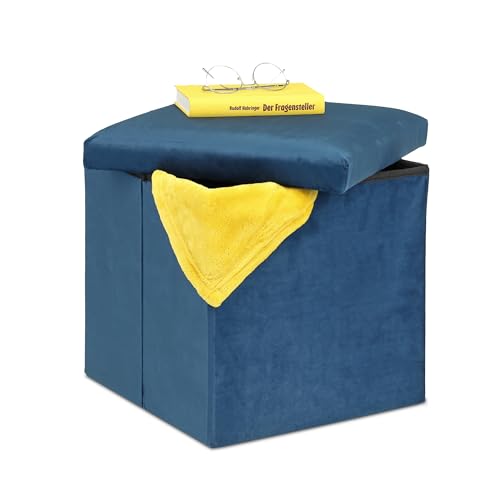 Relaxdays Tabouret, Siège avec Rangement, H x L x P : 38 x 38 x 38 cm, Pliable, Tabouret en MDF et Velours, Bleu