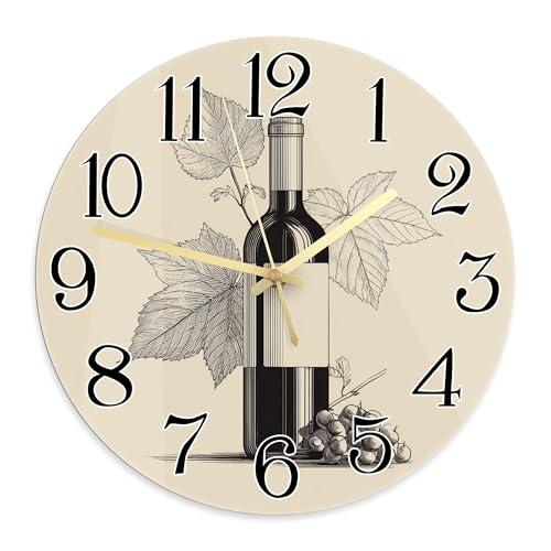 Horloge murale vintage rustique en forme de bouteille de vin, motif feuilles de raisin, beige, silencieuse, sans bruit de tic-tac, pour garage, salle de jeux, décoration extérieure, 29 x 29 cm