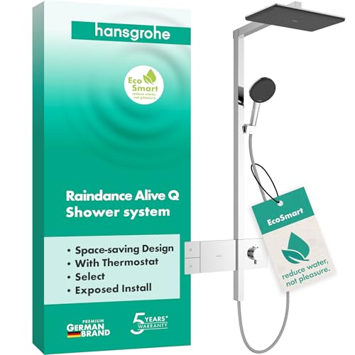 hansgrohe Raindance Alive Q Système de douche à économie d'eau (EcoSmart) avec thermostat, douche effet pluie (340 x 210 mm) avec robinet, douchette, tuyau, barre de douche et pommeau de douche