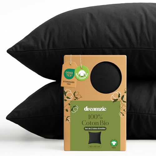 Dreamzie - 100% Coton Biologique - Taie Oreiller 60x60 cm Coton Bio - Lot de 2 - Noir - Taie d'oreiller avec Fermeture Éclair - Oeko-Tex
