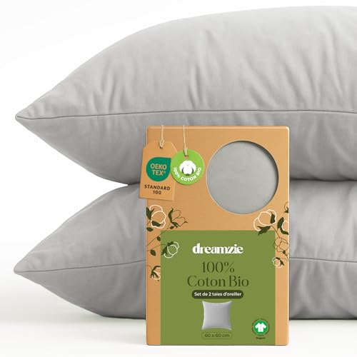 Dreamzie - 100% Coton Biologique - Taie Oreiller 60x60 cm Coton Bio - Lot de 2 - Gris - Taie d'oreiller avec Fermeture Éclair - Oeko-Tex