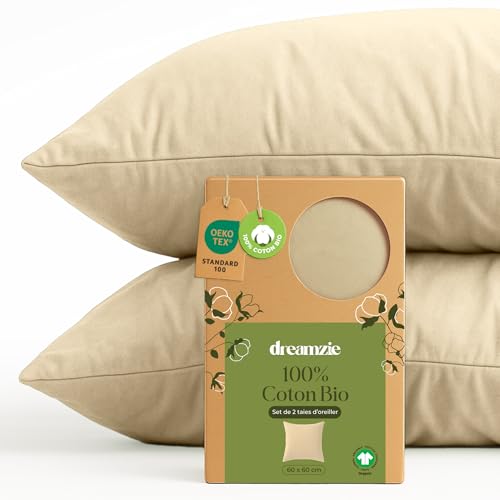 Dreamzie - 100% Coton Biologique - Taie Oreiller 60x60 cm Coton Bio - Lot de 2 - Beige - Taie d'oreiller avec Fermeture Éclair - Oeko-Tex