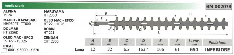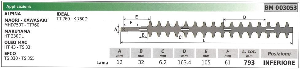 Lame inférieure adaptable pour taille-haie ALPINA DOLMAR MARUYAMA et ROBIN - Longueur totale: 790mm