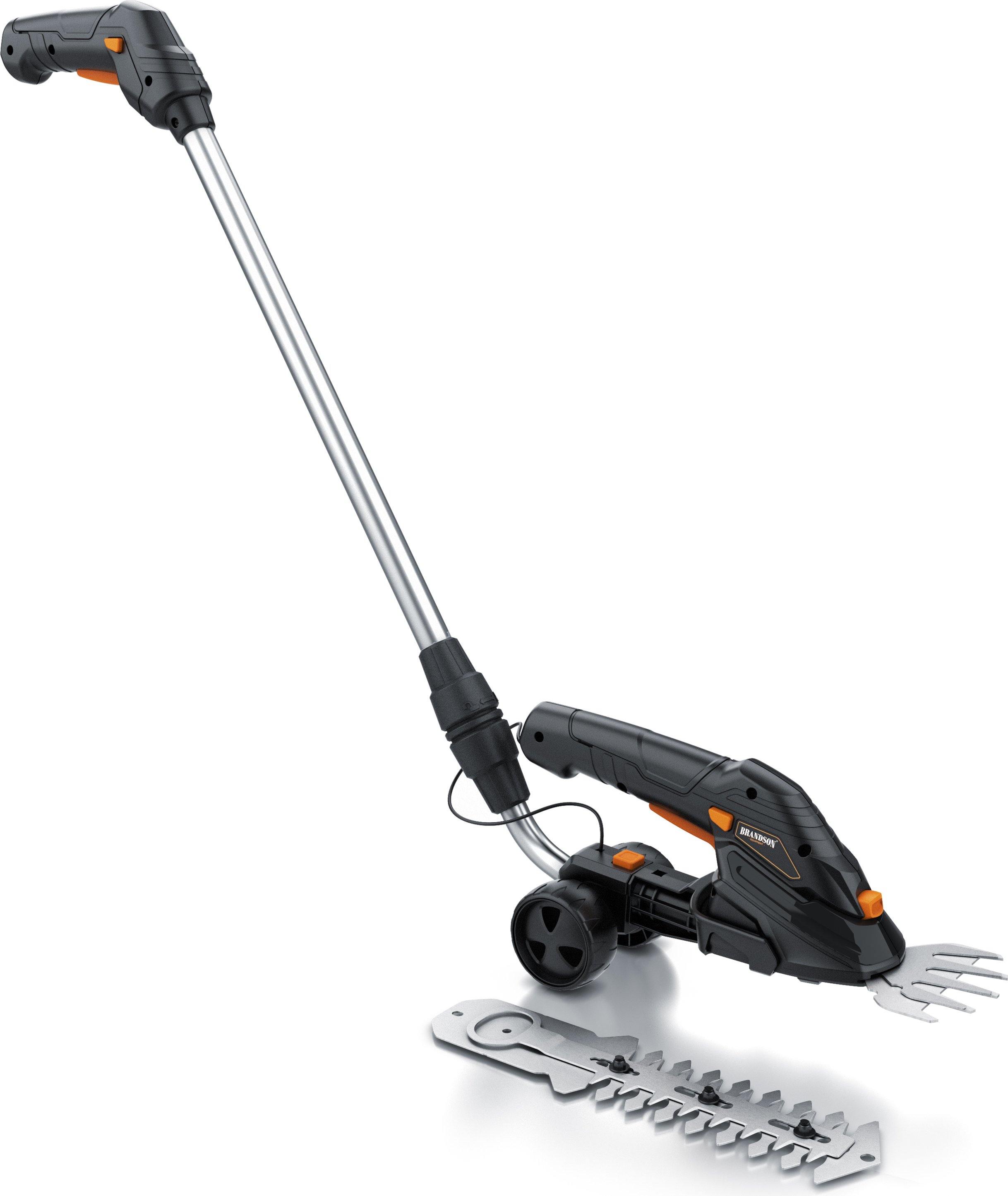 Brandson cisaille à gazon sans fil, cisaille à gazon et à buissons, taille-haies, cisaille à buissons électrique avec lame à gazon et à buissons, y compris manche télescopique 90-130 cm avec roues, chargeur et batterie 2000 mAh