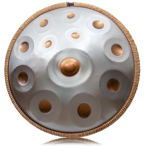 LOMUTY Handpan D Mineur Kurde 440HZ 22 Pouces 14 Tons, Acier Drum Instrument de Musique, Tambour Avec Sac, Handpan Stand, Tambourin Pour La Guérison Sonore, La Méditation Ou Le Yoga, Argent