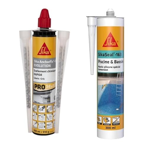 SIKA - Scellement chimique à prise rapide - Fixation d'objets lourds - Int/Ext - Ton pierre - 300ml + Mastic silicone spécial joint pour piscine - Resistant au chlore - Blanc - 300ml