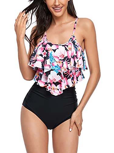 FLYILY Maillot de Bain Tankini pour Femme Haut Double à Volants Taille Haute Maillots de Bain 2 pièces Maillots de Bain(1-BlackFlower,M)