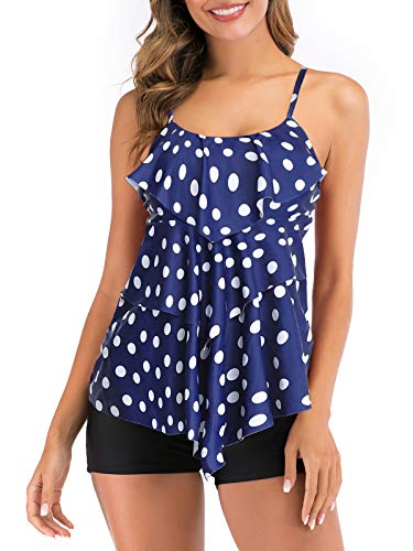 FLYILY Maillot de Bain 2 Pièces Femme Tankini Ensembles à Volants Maillot Haut Imprimé avec Short de Garçon(BlueDot,L)