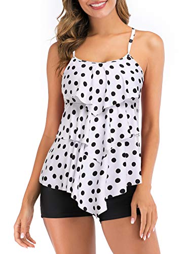 FLYILY Maillot de Bain 2 Pièces Femme Tankini Ensembles à Volants Maillot Haut Imprimé avec Short de Garçon(WhiteDot,L)