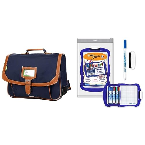 Cartable 38 cm Tann's Les Signatures Camille Bleu Marine & BIC Velleda Ardoise Ecolier Double Face (21 x 31 cm) Effaçable à Sec avec 8 Feutres Effaçables à Sec et Effacette - Bleue, Lot de 1