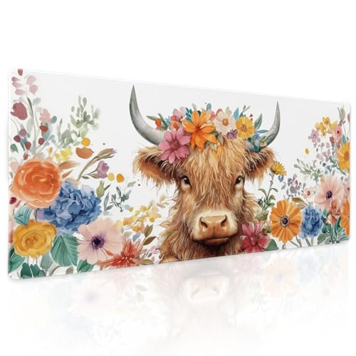 Tapis de souris de jeu esthétique avec motif vache des Highlands XL - Motif vache bleue et orange - Grand tapis de souris étendu - Base en caoutchouc antidérapante - Bords cousus - Tapis de clavier