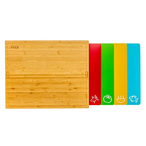 Axer Grand Set de Planches à Découper en Bois de Bambou avec Tapis de Découpe en Plastique Flexible Coloré Lavable au Lave-vaisselle - des Tapis à 4 Codes de Couleur avec des Icônes Alimentaires