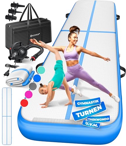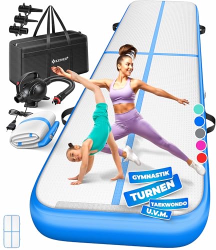 KESSER® Tapis de Gymnastique | Tapis de Fitness Gonflable Airtrack | Tapis de Gymnastique 3/4/5/6 m | Sac de Transport et Batterie électrique fournis Pompe à air, Bleu, 600 x 100 x 10 cm