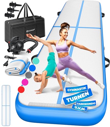 KESSER® Tapis de Gymnastique | Tapis de Fitness Gonflable Airtrack | Tapis de Gymnastique 3/4/5/6 m | Sac de Transport et Batterie électrique fournis Pompe à air, Bleu, 500 x 100 x 10 cm