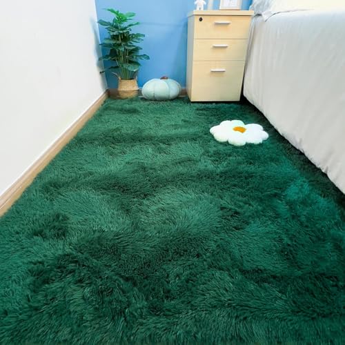 HOKXUAN Tapis Chambre Tapis Modernes de Salon 80 x 70 cm Lavable, Antidérapant, Moelleux Longs Tapis de Sol Moelleux Shaggy Personnalisable Au Mètre pour Salon, Coucher, Vert Foncé