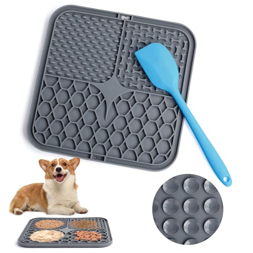 Romon Tapis de Lèche Chien, 20x20cm Tapis Lécher pour Chien avec Spatule Silicone, sans BPA Tapis de Lechage pour Chat avec Ventouse pour Bain, Entraînement, Toilettage (Gris)