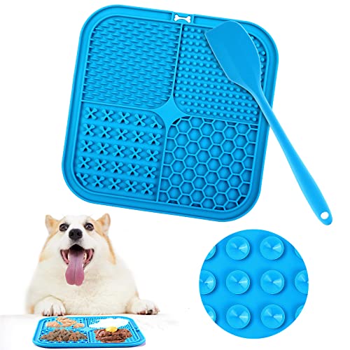 Romon Tapis de Lèche Chien, 20x20cm Tapis Lécher pour Chien avec Spatule Silicone, sans BPA Tapis de Lechage pour Chat avec Ventouse pour Bain, Entraînement, Toilettage (Bleu)