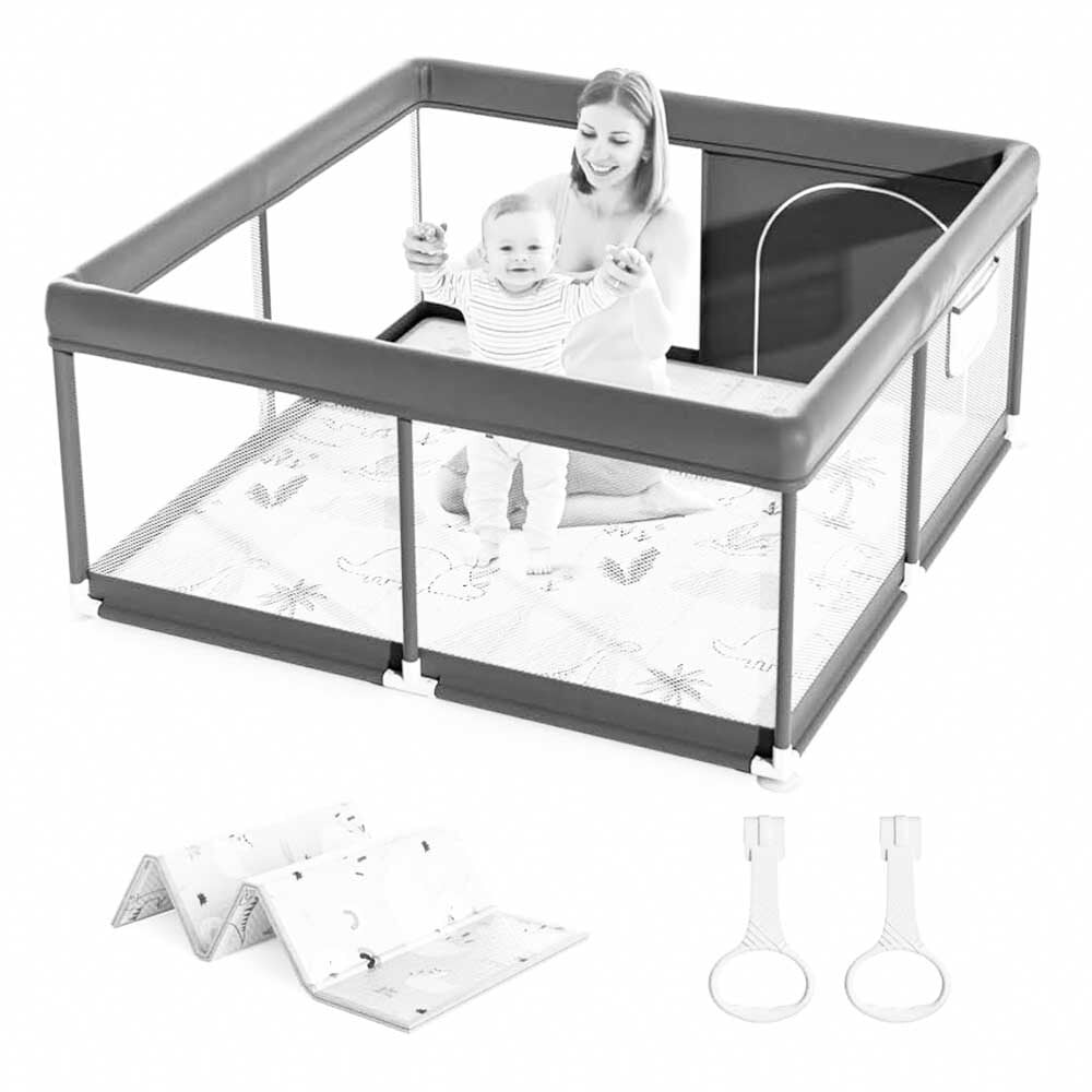 Mloong parc bébé avec tapis d'éveil, 120x120x65cm petit parc bébé gris foncé, parc pour appartement, parc avec filet respirant sur quatre côtés et ventouses, gris foncé