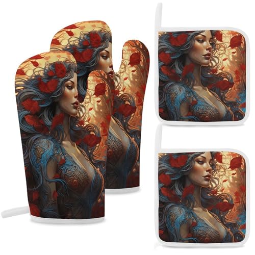Lot de 4 maniques et maniques résistants à la chaleur, double couche épaisse avec boucle de suspension, gants de cuisine de style rock psychédélique et tapis chaud pour cuisine, pâtisserie, grillades