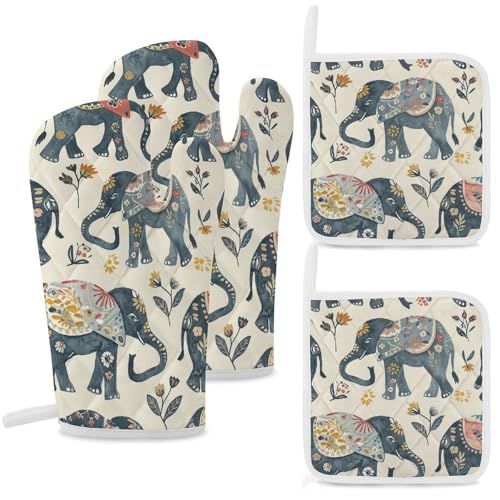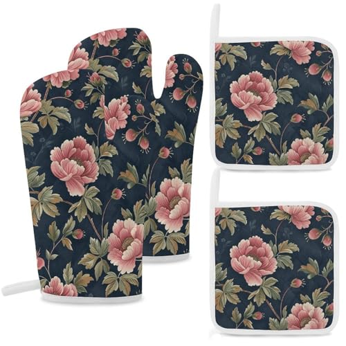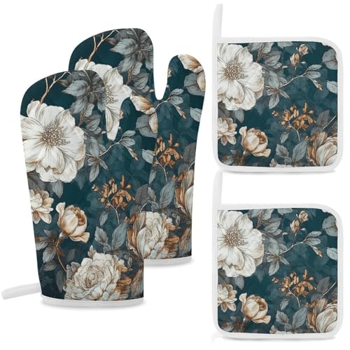 Lot de 4 maniques et maniques résistants à la chaleur, double couche épaisse avec boucle de suspension, gants de cuisine à motif floral et tapis chauffant pour cuisine, pâtisserie, grillades