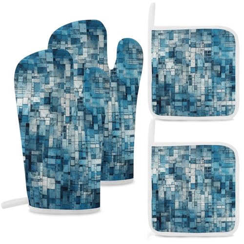 Lot de 4 maniques et maniques résistants à la chaleur, double couche épaisse avec boucle de suspension, gants de cuisine carrés bleus et beiges et tapis chaud pour cuisine, pâtisserie, grillades