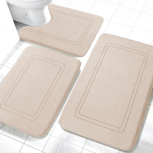 chakme Lot de 3 tapis de salle de bain en mousse à mémoire de forme souple et tapis de WC en forme de U - Antidérapant et lavable - Beige