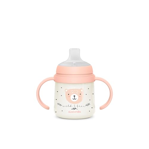 Suavinex, Biberon à Anses, Tasse Apprentissage Bébé avec Bec Souple en Silicone, Système Anti-Colique, Gourde Enfant avec Poignées, Antifuites, Passe au Lave-Vaisselle, +6 Mois, 270 ml, Bears Rose