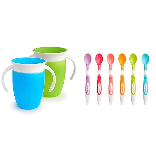Munchkin Tasse d’Apprentissage Miracle 360, Tasse Enfant sans BPA avec Poignées - 207ml, Lot de 2,Bleu/Vert & Cuillères Bébé 1er Âge Soft Tip, Lot de Cuillères d’Apprentissage avec Manches - Pack de 6