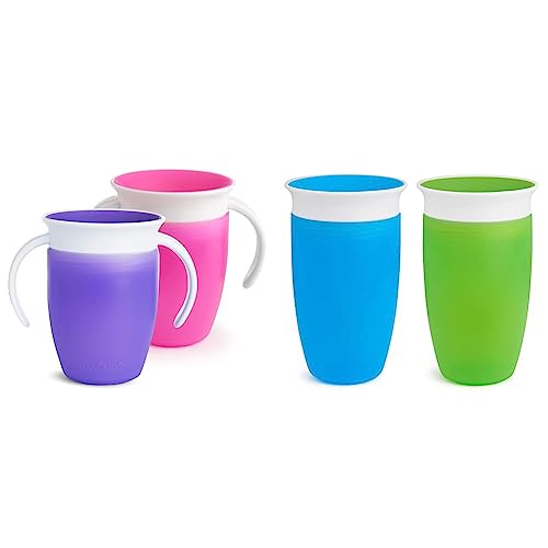 Munchkin Tasse d’Apprentissage Miracle 360, Gobelet Bébé, Tasse Enfant sans BPA avec Poignées - 207 ml, Lot de 2, Rose/Violet & Tasse d’Apprentissage Miracle 360-296 ml, Lot de 2, Bleu/Vert