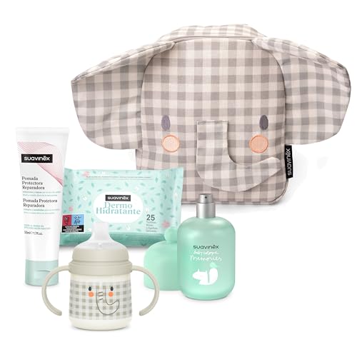 Suavinex, Sac à dos de crèche pour bébés, panier - Cadeau pour bébé avec : Baby Cologne Memories 100 ml + crème couche 50 ml + Pack 25 lingettes dermohidratantes + tasse d'apprentissage, éléphant gris