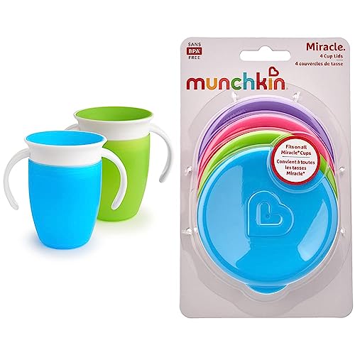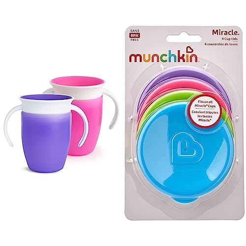 Munchkin Tasse d’Apprentissage Miracle 360, Gobelet Bébé, Tasse Enfant sans BPA avec Poignées - 207 ml, Lot de 2, Rose/Violet & Tasse Miracle 360ᵒ Couvercles - multicolores, lot de 4