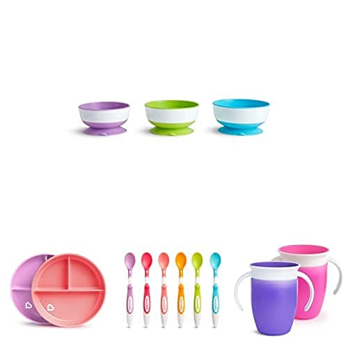 Munchkin Lot de 3 ventouses Stay Put avec ventouse, Rose&Violet, Lot de 6 cuillères pour bébé à extrémité souple, Tasse d'Apprentissage Miracle 360, Rose&Violette