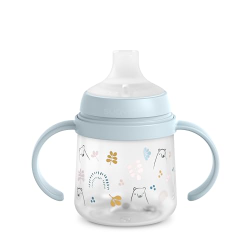 Suavinex, Tasse Apprentissage avec Bec Rigide Anti-Râpage, Tasse Bébé Anti - Fuite, Gobelet Enfant avec Couvercle Rabattable et Poignées, Passe au Lave-Vaisselle. +6 Mois, 200 ml. Bears, Bleu