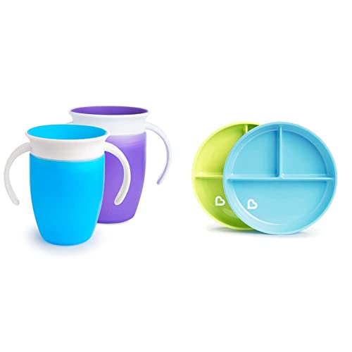 Munchkin Tasse d’Apprentissage Miracle 360, Gobelet Bébé - 207 ml, Lot de 2, Bleu/Violet & Assiettes à Compartiments Stay Put, Assiettes d’Apprentissage Enfant avec Ventouse - Bleu/Vert, Lot de 2