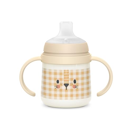Suavinex, Tasse Apprentissage pour Bébé, avec Disque Anti-Fuite, Magic Cup Rebord Antifuite 360°, Anses Amovibles, Couvercle Hygiénique, Compatible Lave-Vaisselle, 340 ml, +12 Mois, Wonderland, Beige