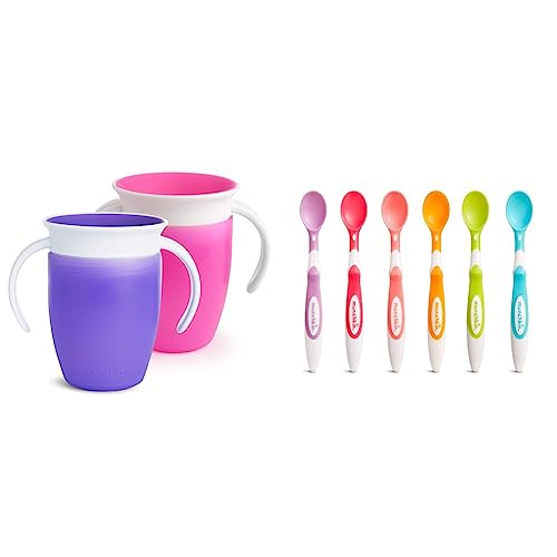 Munchkin Tasse d’Apprentissage Miracle 360, Gobelet Bébé, Tasse Enfant sans BPA avec Poignées, Tasse Magique Antifuites - 207 ml, Lot de 2, Rose/Violet & Cuillères Bébé 1er Âge Soft Tip - Pack de 6