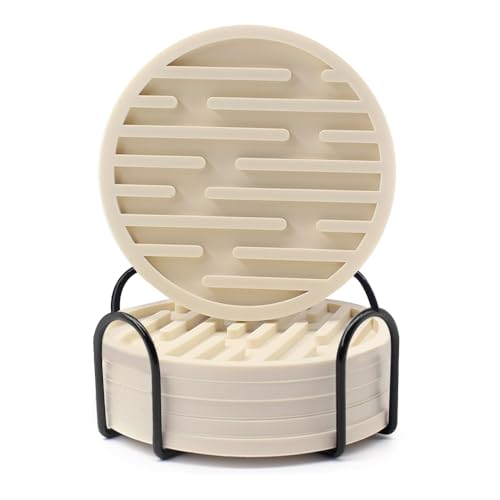 Dessous de Verre en Silicone, 6 Pcs sous-Verres Isolé Antidérapants, 10cm Tapis Tasse égouttoir, avec Support de Rangement Métal pour la Protection de la Table