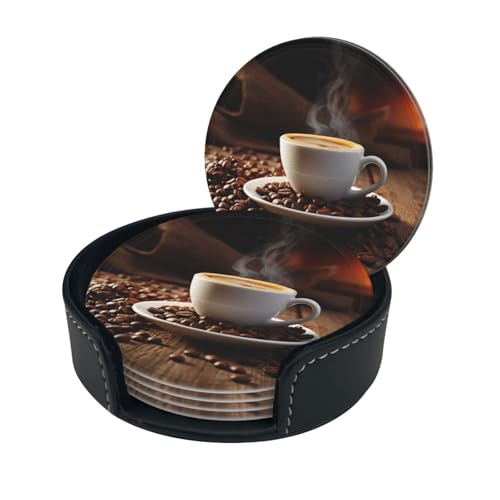 Dessous de Verre en Cuir imprimé Tasse à café et Grains de café pour Boissons, Ensemble de sous-Verres pour Boissons, Tapis de Tasse avec Support pour Boissons Chaudes ou Froides, Lot de 6