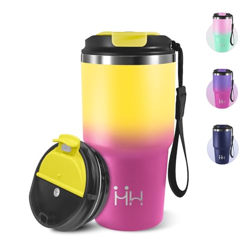 Mug Isotherme Cafe, 600 ml, Tasse à Café Isotherme avec Couvercle, 304 Acier Inoxydable, Réutilisable Tasse de Voiture avec Couvercle, Idéal pour le Café à Emporter et Le Bureau - Jaune&rose rouge