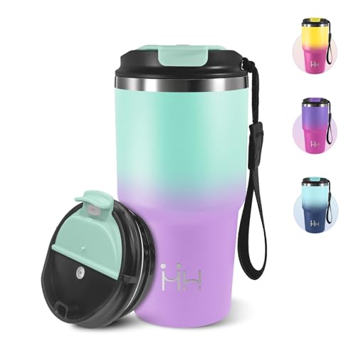 Mug Isotherme Cafe, 600 ml, Tasse à Café Isotherme avec Couvercle, 304 Acier Inoxydable, Réutilisable Tasse de Voiture avec Couvercle, Idéal pour Déplacements Quotidiens - Vert lac&violet clair