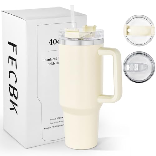 FECBK Mug Isotherme avec Paille et Poignée 1.2L, Tasse Isotherme 100% Anti-fuite, 34 Heures Froid, 12 Heures Chaud, Gobelet en Acier Inoxydable, Lavable au Lave-Vaisselle, Beige