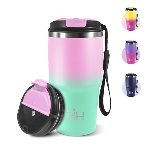 Mug Isotherme Cafe, 600 ml, Tasse à Café Isotherme avec Couvercle, 304 Acier Inoxydable, Réutilisable Tasse de Voiture avec Couvercle, Idéal pour Déplacements Quotidiens - Rose clair&vert clair