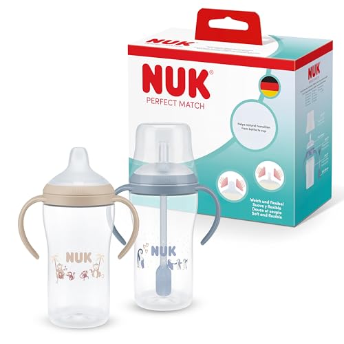 NUK Perfect Match Tasse d’apprentissage avec paille pour bébé | 6+ mois | 260 ml | Tasse avec paille anti-fuite pour bébé | Poignées antidérapantes | Singe/Pingouin | Lot de 2