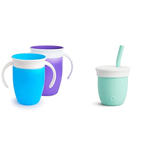 Munchkin Tasse d’Apprentissage Miracle 360, Gobelet Bébé, Tasse Enfant sans BPA avec Poignées - 207 ml, Lot de 2, Bleu/Violet & C'est Silicone Gobelet d'Apprentissage Avec Paille - 118ml Vert Pastel