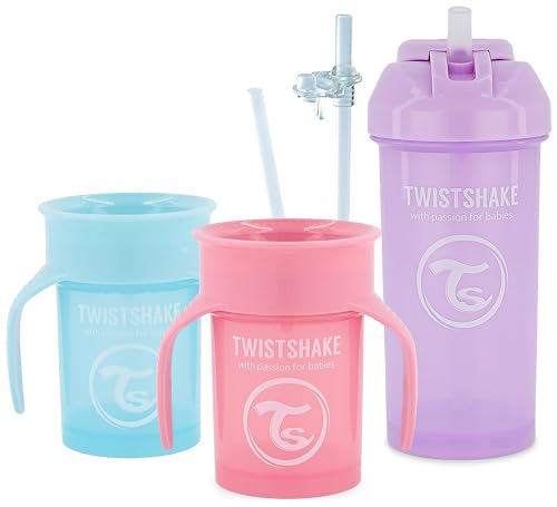 Twistshake Ensemble de Gobelets pour Bébé – 3 Pièces | 2 x 360 Tasses - 1 x Tasse en Paille | Comprend 2 Pailles Supplémentaires et un Joint Etanche | Tasse Sippy D’entraînement | Rose Bleu